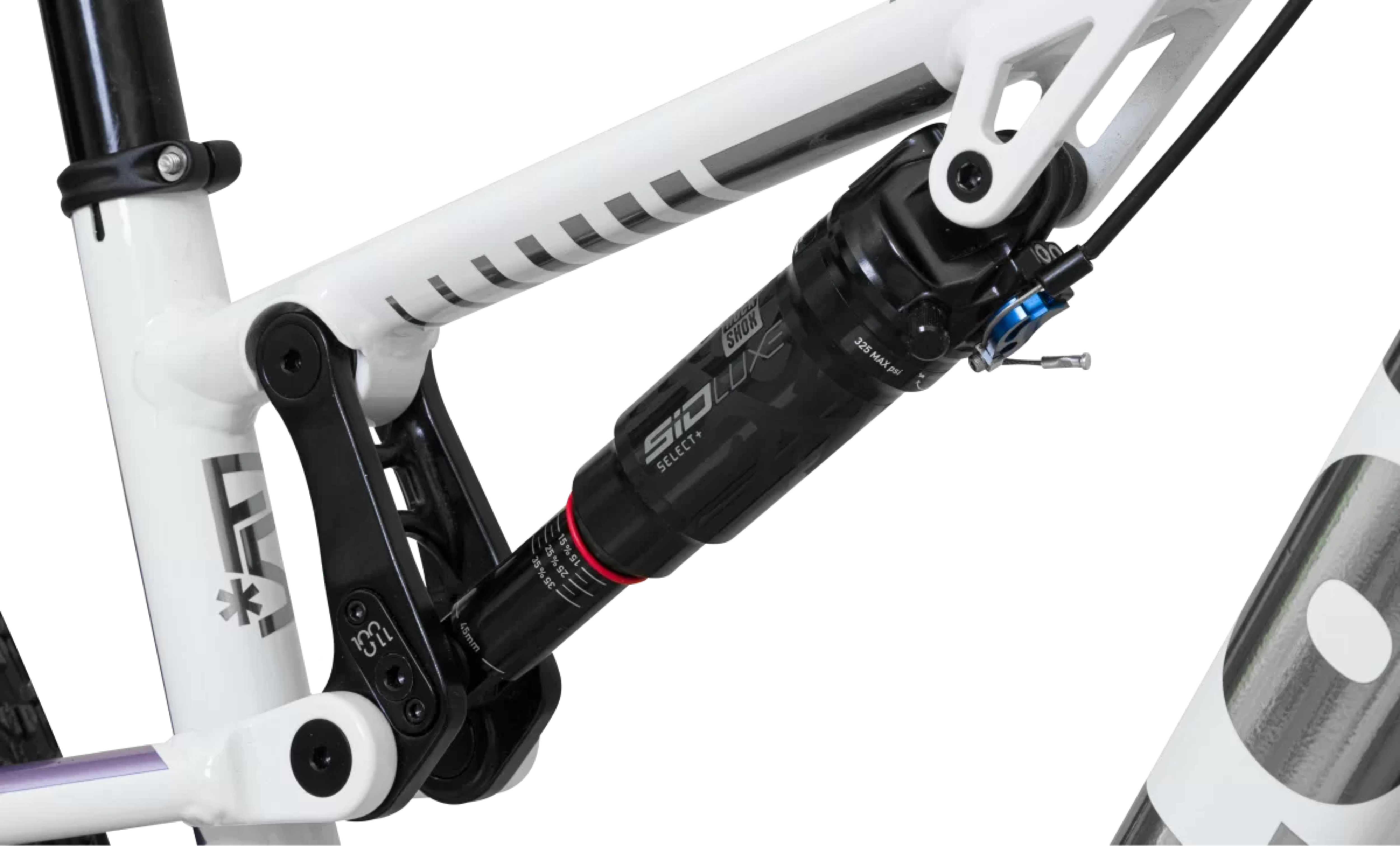 O sistema de suspensão conta com garfo Rockshox Reba, com sistema a ar e 100mm de curso, e RockShox SID Luxe Select 190/45mm. Além disso, vem com a tecnologia Hybrid Travel no link, que permite duas posições de utilização: com 100mm ou com 110mm, ao equipar um garfo de 110mm de curso.