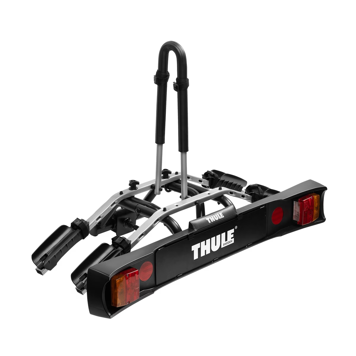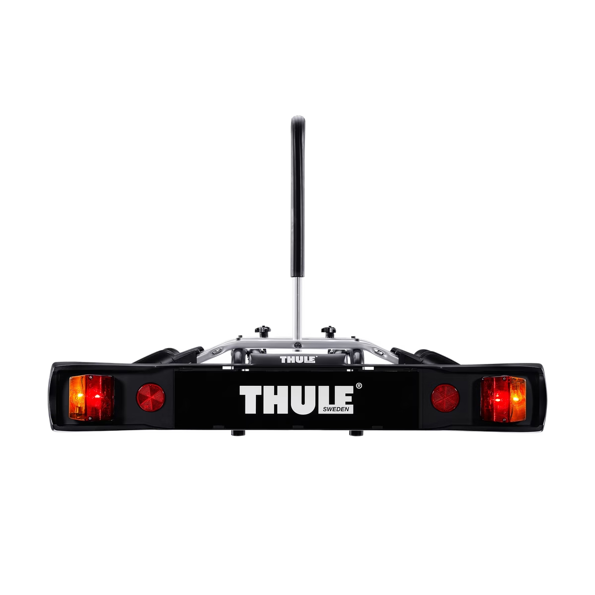 Suporte suspenso para 3 bicicletas para engate preto/alumínio; Acesso ao porta-malas com as bicicletas montadas graças ao recurso de inclinação com as mãos; Acoplamento inteligente, compatível com a maioria dos engates; Aperto das rodas com cintas macias; Trava o suporte para bicicleta no engate com o acessório Thule Lock 957.